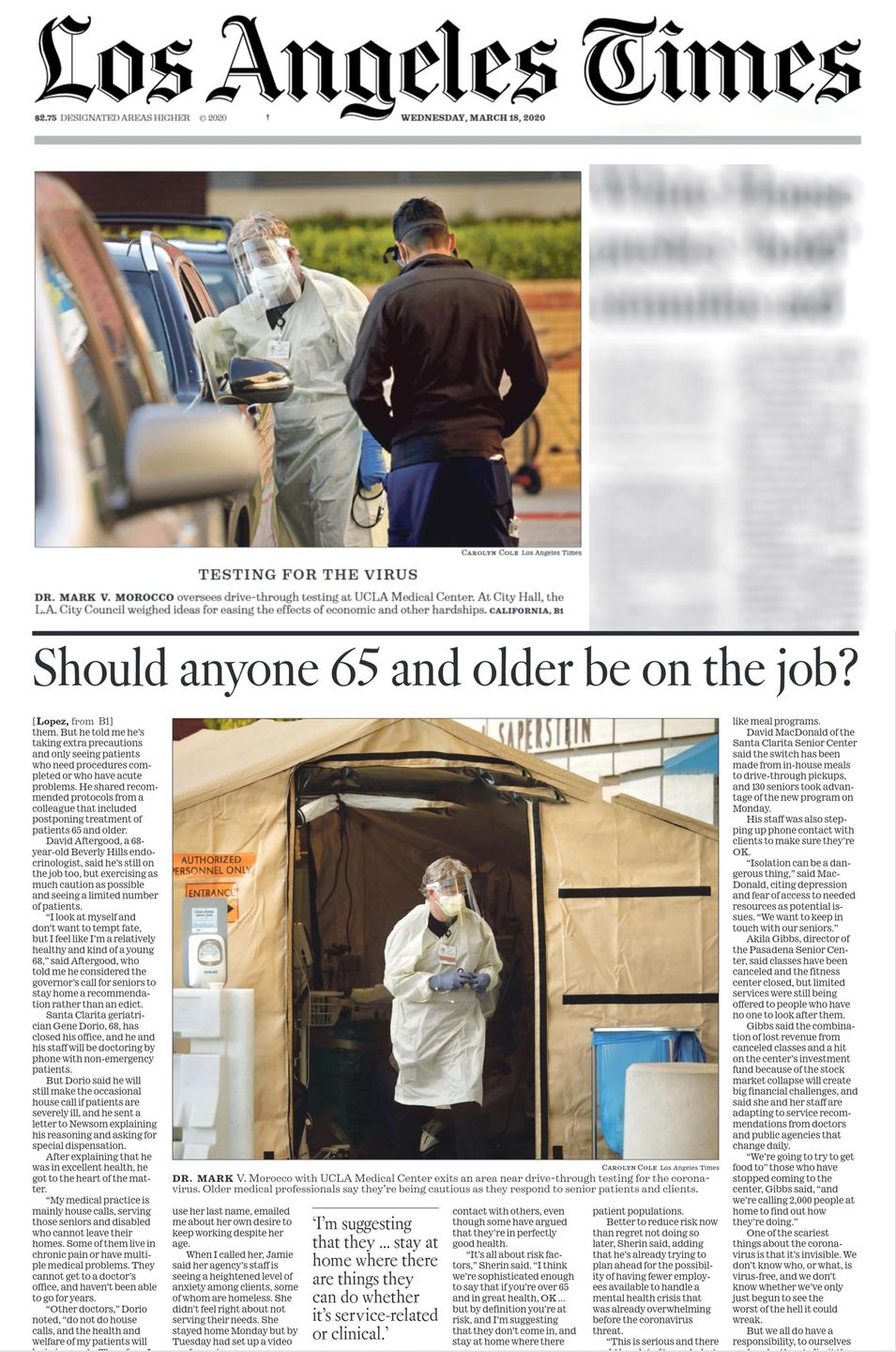 The LA Times made an error in assuming he was doing a drive thru Covid test. This is false. He was treating a sick patient in her car. At this time UCLA does not have drive thru testing.